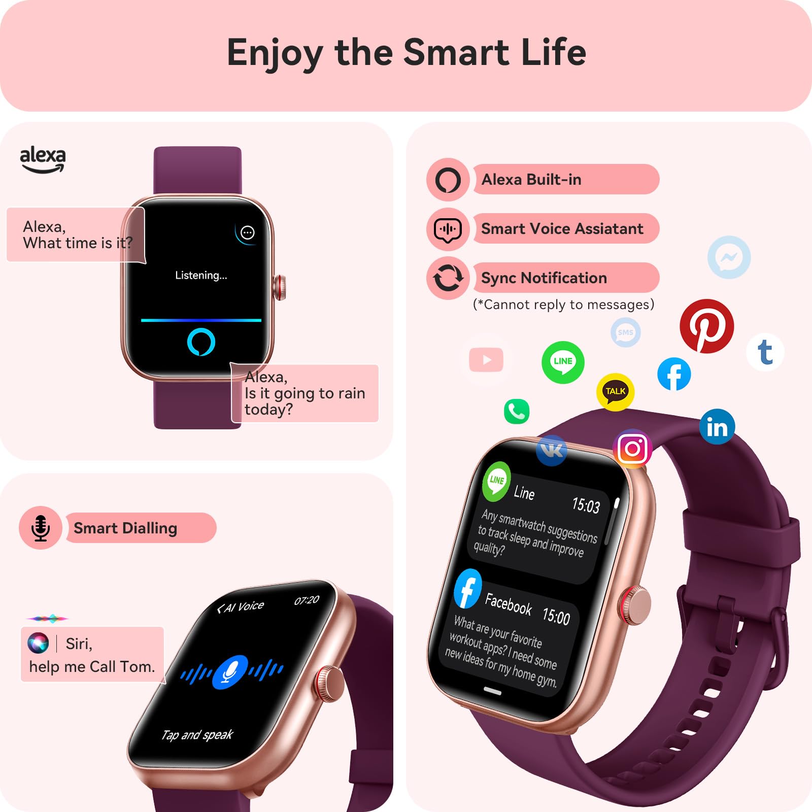 【BUILT-IN ALEXA & BLUETOOTH CALLING】This brand-new smart watch features an integrated Amazon Alexa voice assistant and supports Bluetooth calling. You can interact with the watch to check messages, play music, set reminders and manage your schedule, get weather and traffic updates, and more. It significantly reduces the need to rely on your phone(Sending SMS is not supported).