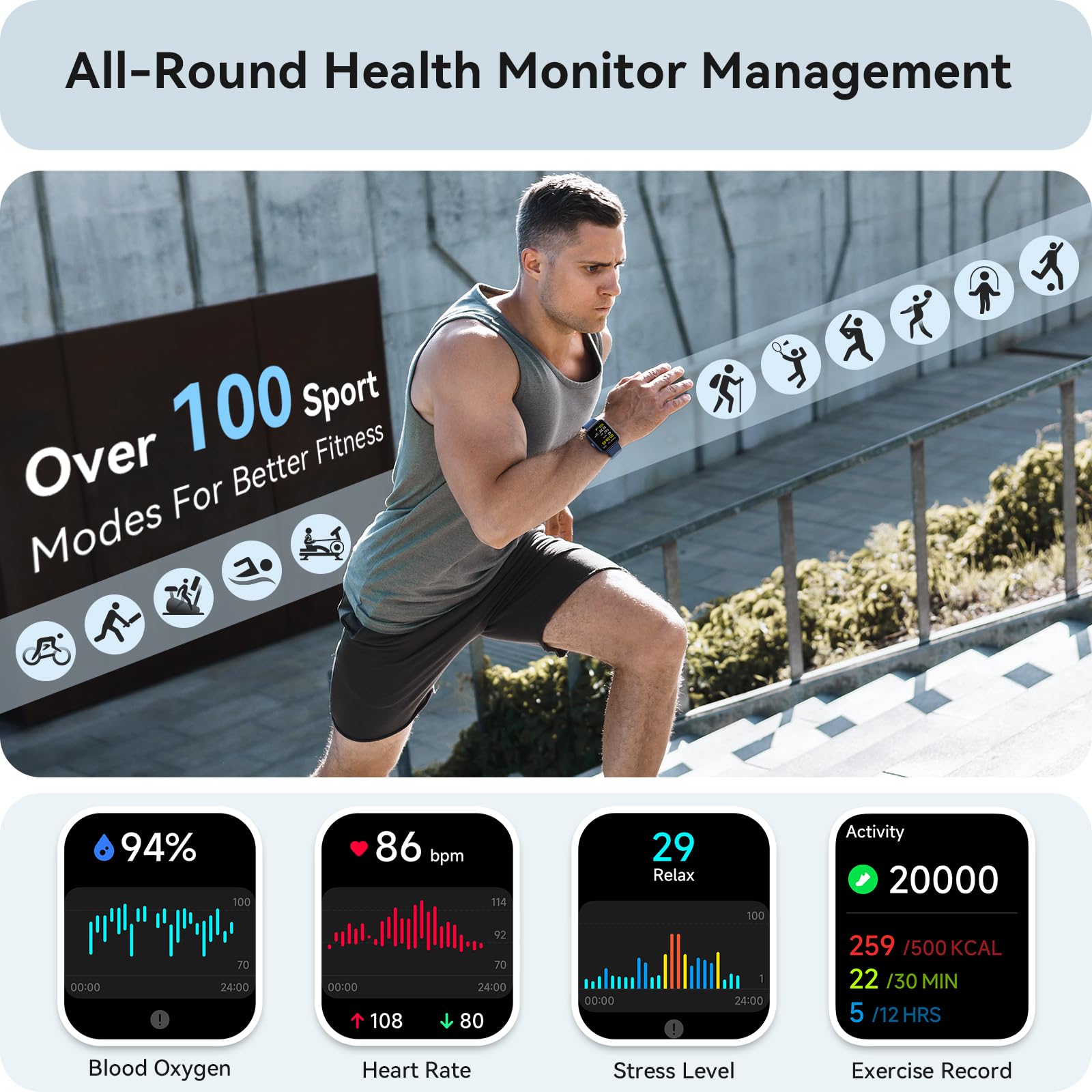 【ACTIVITY TRACKER & IP68 WATERPROOF】This fitness tracker supports over 100 popular sports modes, providing accurate and scientific data for a wide range of indoor and outdoor activities including running, cycling, swimming, baseball, basketball, fitness, yoga, strength training, and free workouts. With an IP68 waterproof rating, you can confidently use it while swimming, sweating, or washing your hands. It's the perfect companion for all fitness enthusiasts!