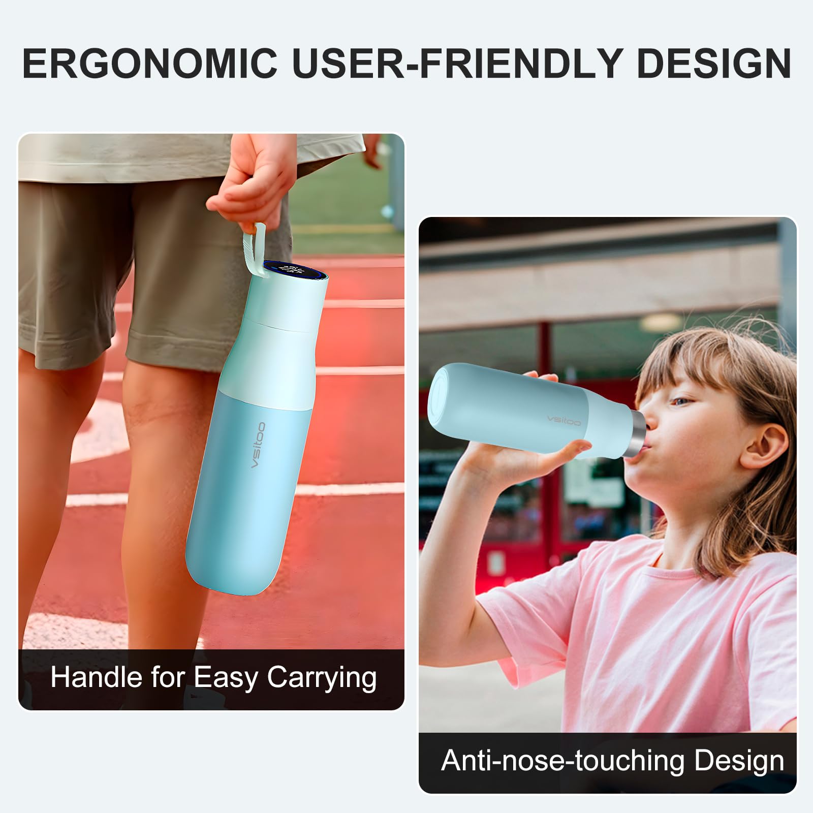 【Smart Self-Cleaning】– This Smart Water Bottle activates powerful Self Cleaning with a long press of the lid screen, ensuring safe, clean drinking water anytime. It also includes a smart auto-cleaning mode for daily auto-refresh mode. A safety lock in the lid automatically pauses the light if aimed toward the human body.