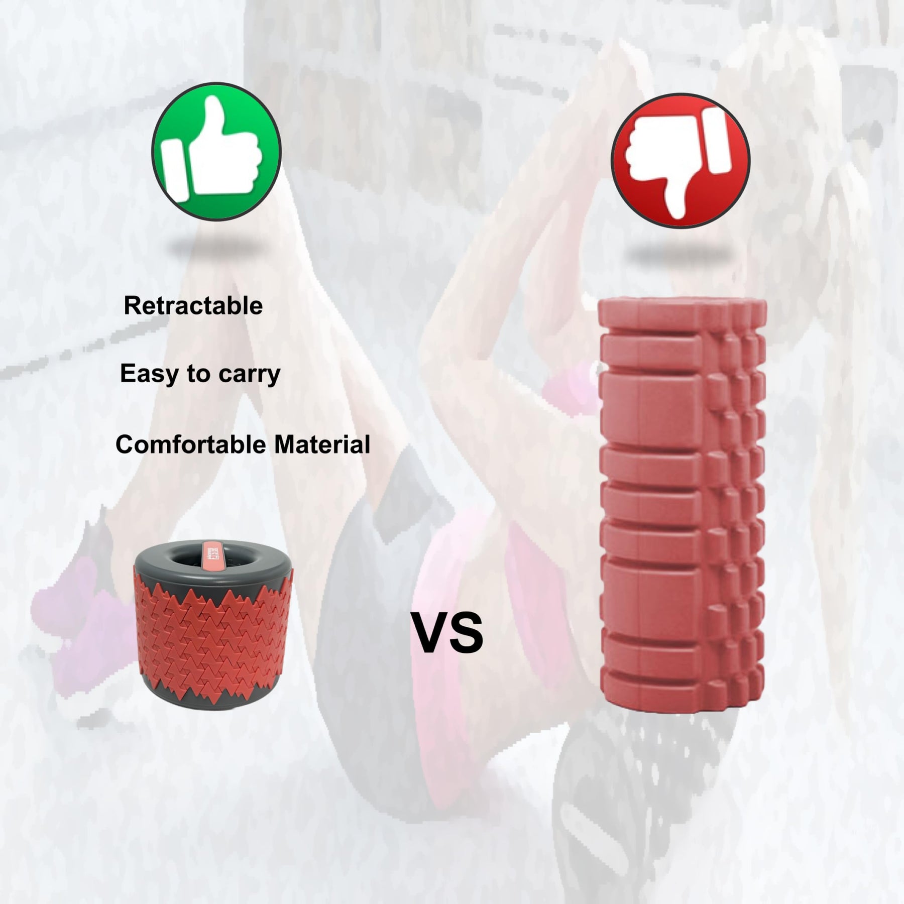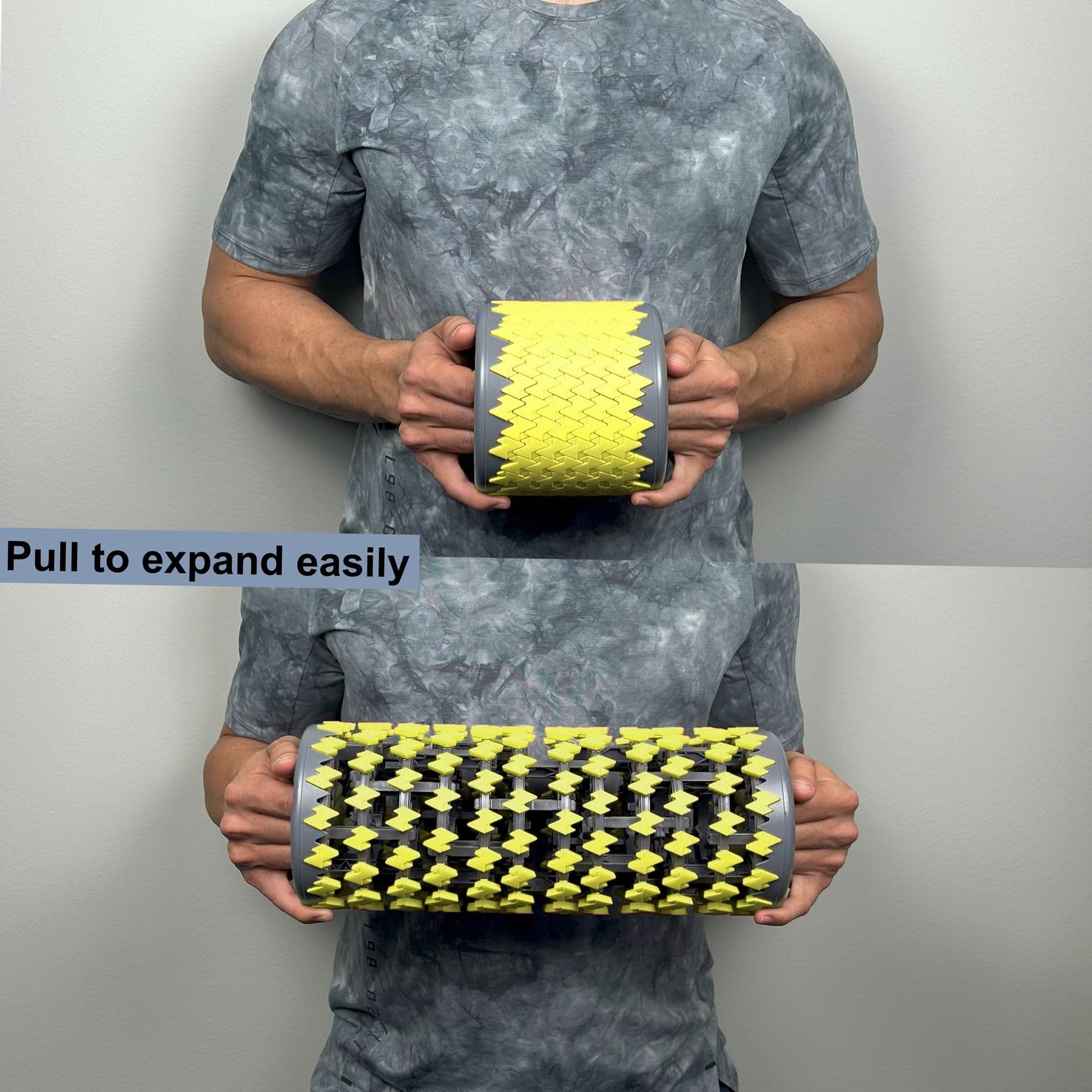 User demonstrating how to use the collapsible foam roller for muscle recovery and post-workout relaxation.