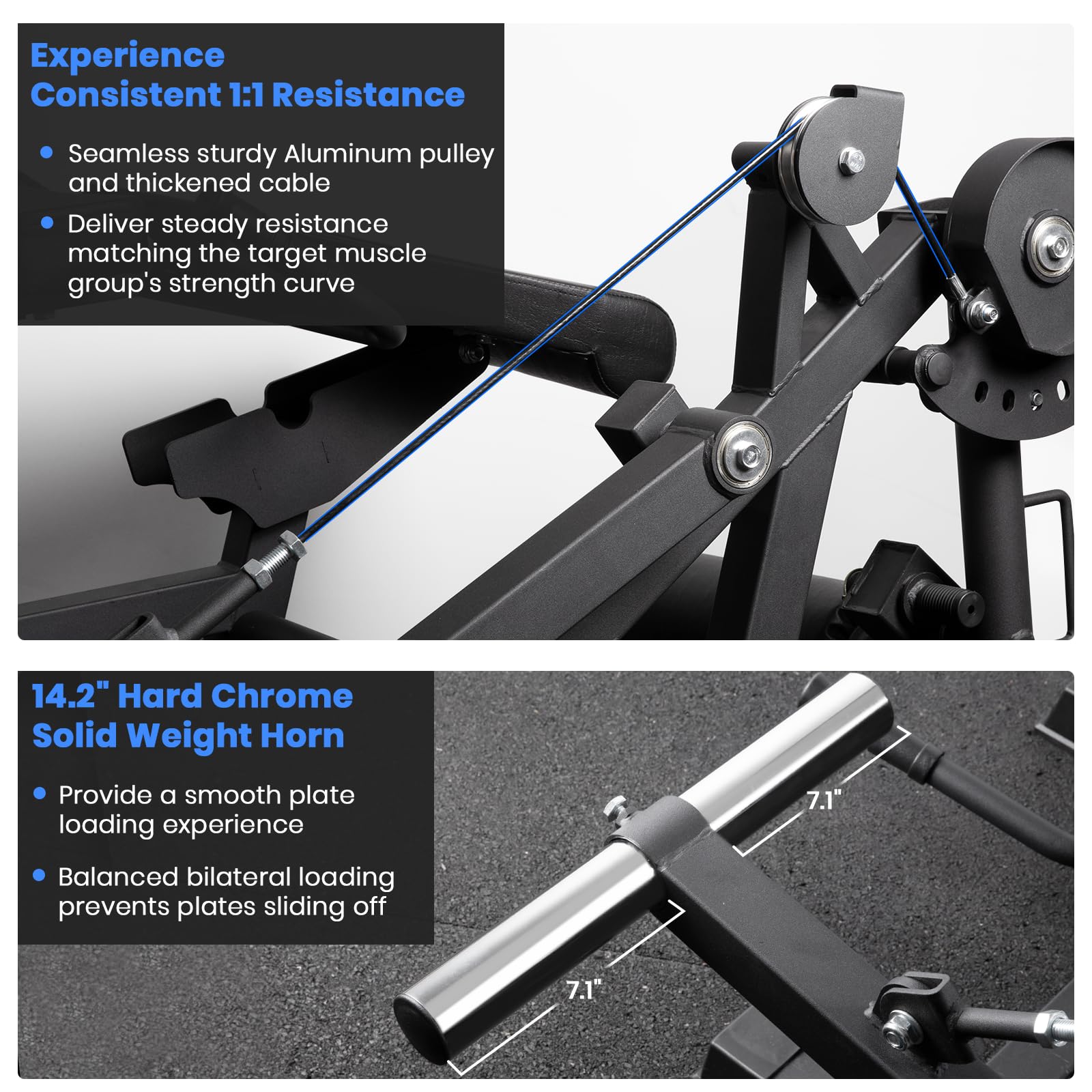 Experience Exercise with Smooth Pulley System: Our Innovative pulley system delivers consistent resistance tailored to the specific strength curve of the targeted muscle group. We specially design an adjustable bolt to regulate tension in case the cable stretches out over the years. You will find pleasure in the seamless resistance during your workout. Plate loading post measures 7.1” per side and fits 2-inch weight plates smoothly with its hard chrome plated surface.