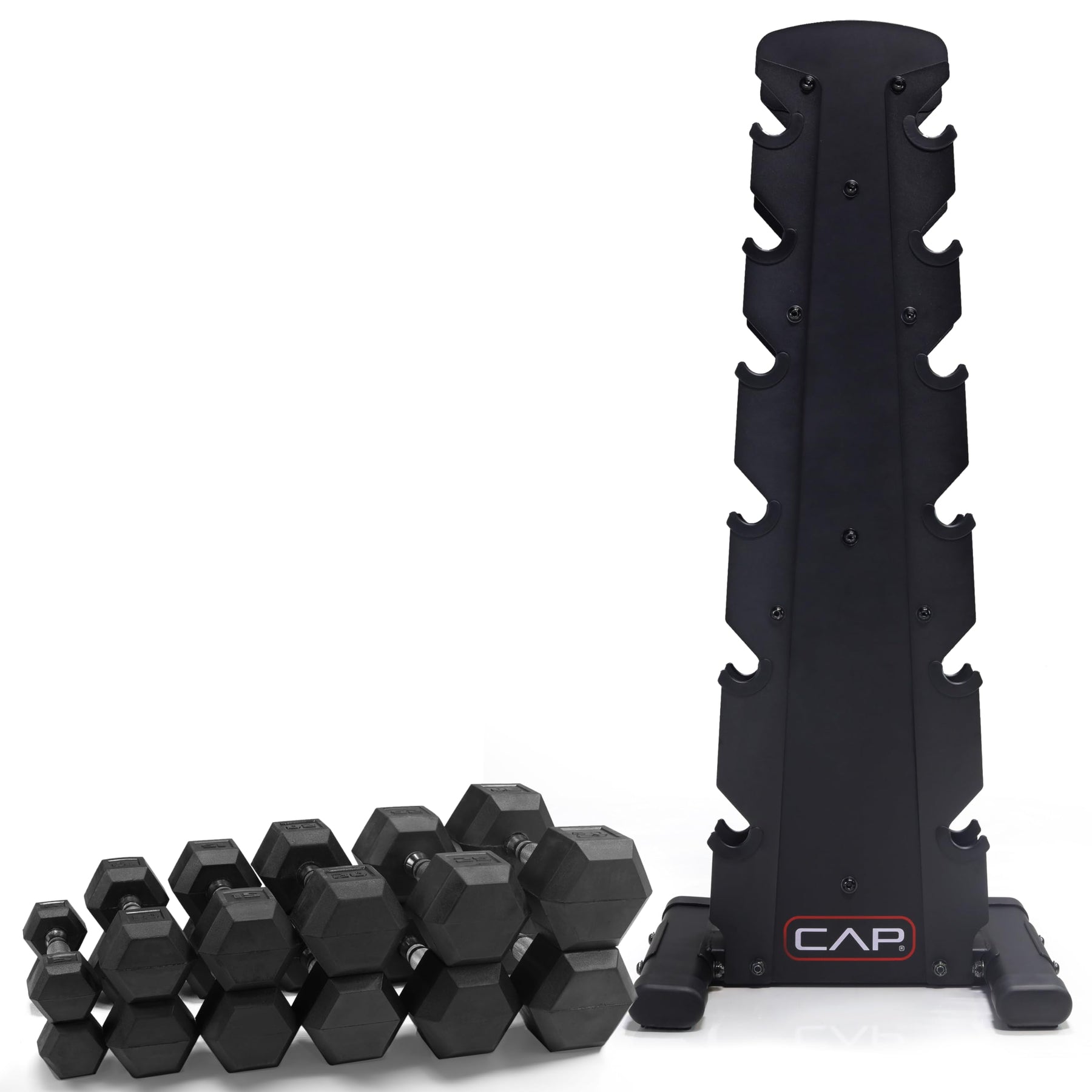 The CAP 150 LB Coated Hex Dumbbell Weight Set with Black A-Frame Rack will add versatility, storage space, and reliability to your home gym. This set includes a pair of 5-pound, 10-pound, 15-pound, 20-pound, and 25-pound rubber hex dumbbell weights and an A-frame rack to store them. The FIVE pairs of dumbbells can be easily stored and accessed using the reliable, durable, space-saving A-frame rack. The dumbbell heads are made from ASTM A48 Class 20 grey iron coated in 80 shore hardness rubber joined together by a solid 1018 cold rolled steel chromed handle, making them durable and reliable. Use dumbbells to target specific muscle groups or add resistance to your strength training routine or HIIT workout. This set allows you to start with light resistance and build your way up to heavier weights, allowing you to attain the fitness goals you’ve set.