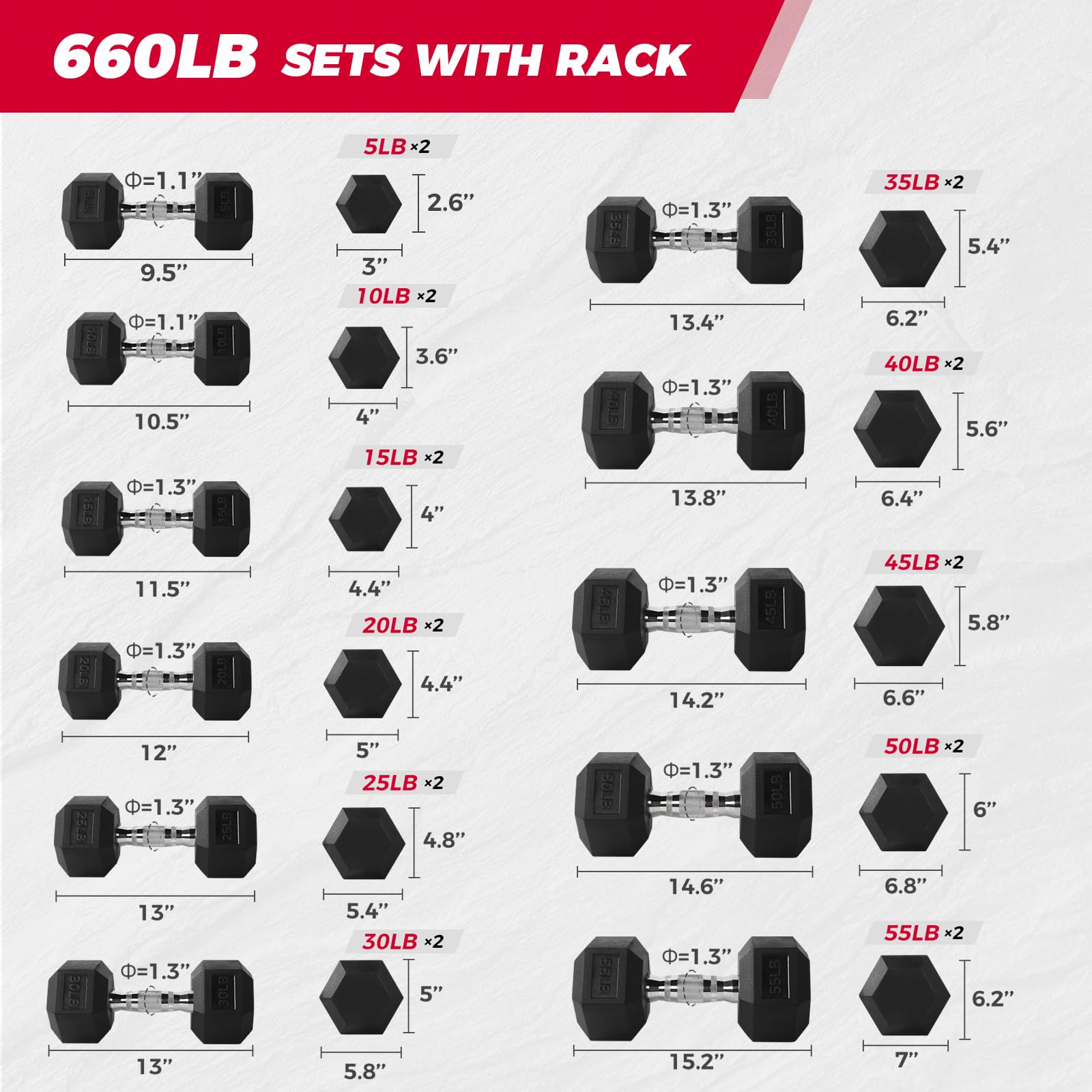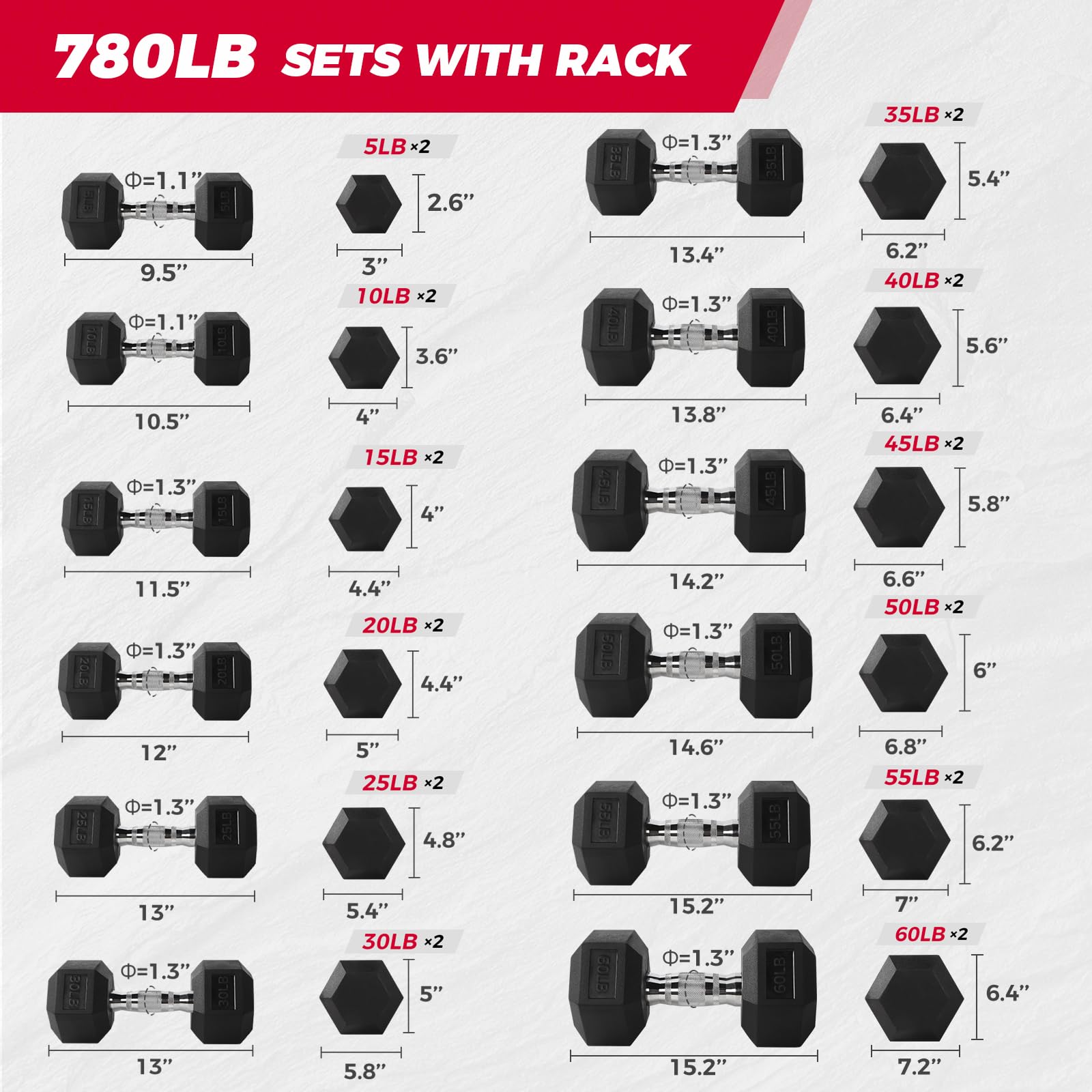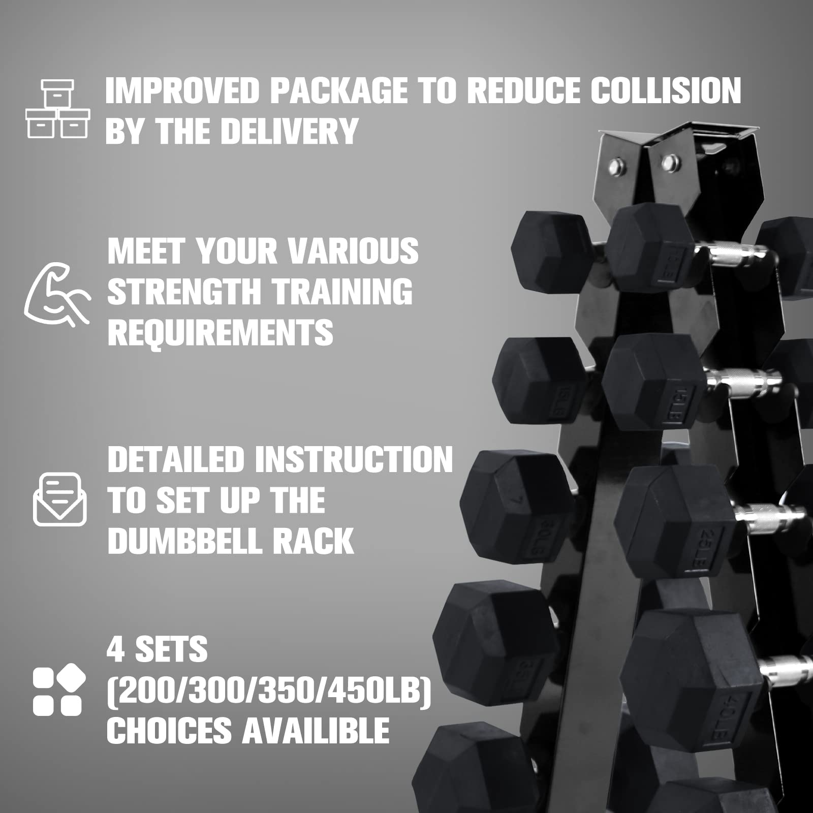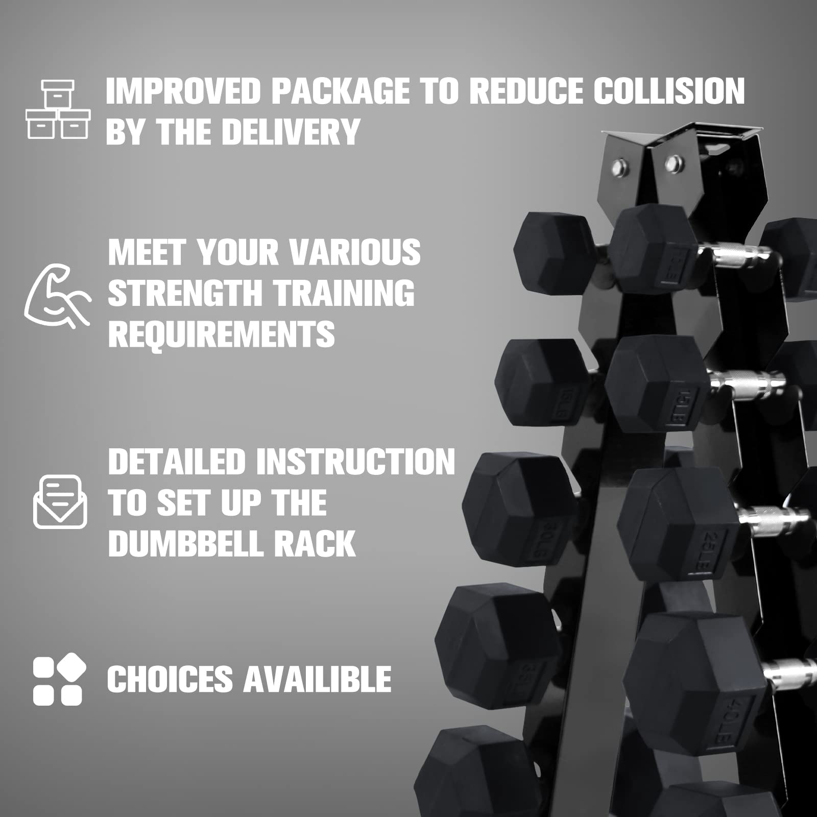 Type: Rubber hex dumbbell set (optional rack)