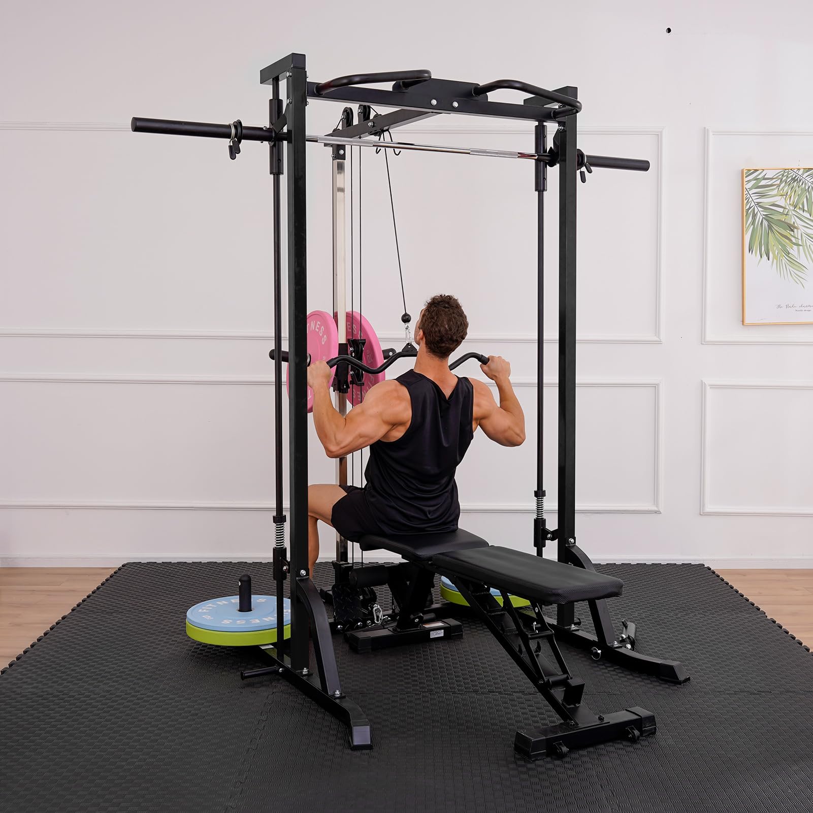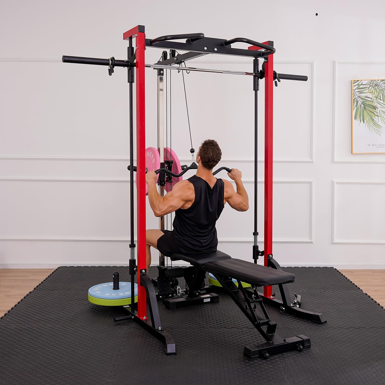 • Free weight compatibility: Use Olympic plates and barbells.